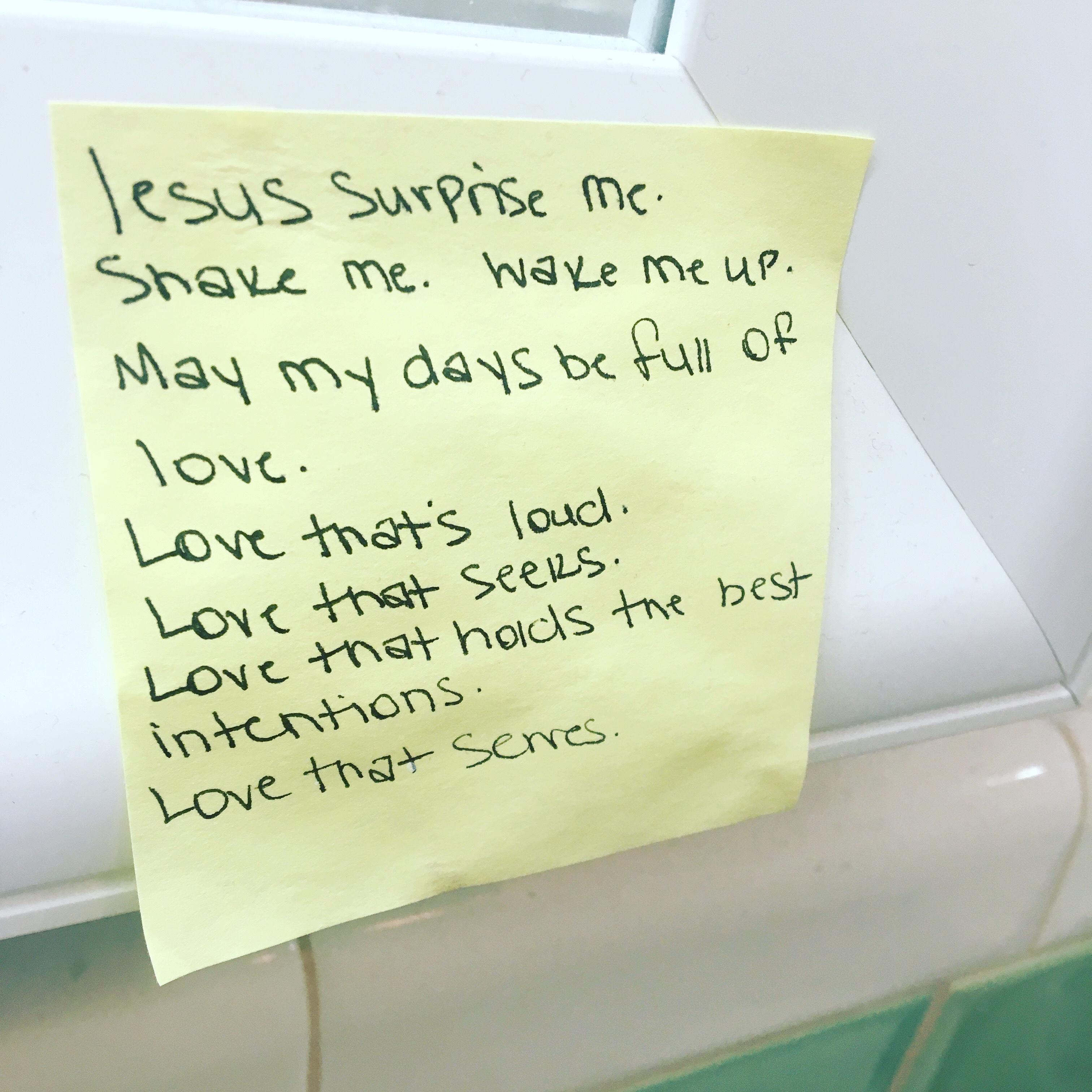 On my mirror is a long-standing reminder, the post-it note having seen better days. It’s crinkled now, the result of many days soaking up steam.