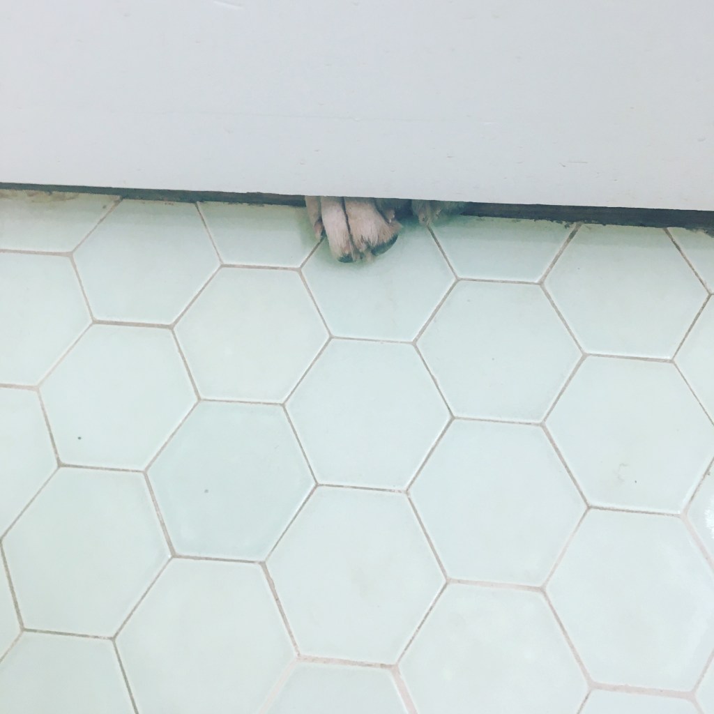 Frustrated with constantly being tripped up, I put her out of the bathroom and closed the door. It wasn’t until I started sweeping, friend still on the phone, that I saw her paws tucked up under the door like she just couldn’t resist having at least some part of herself in there with me.
