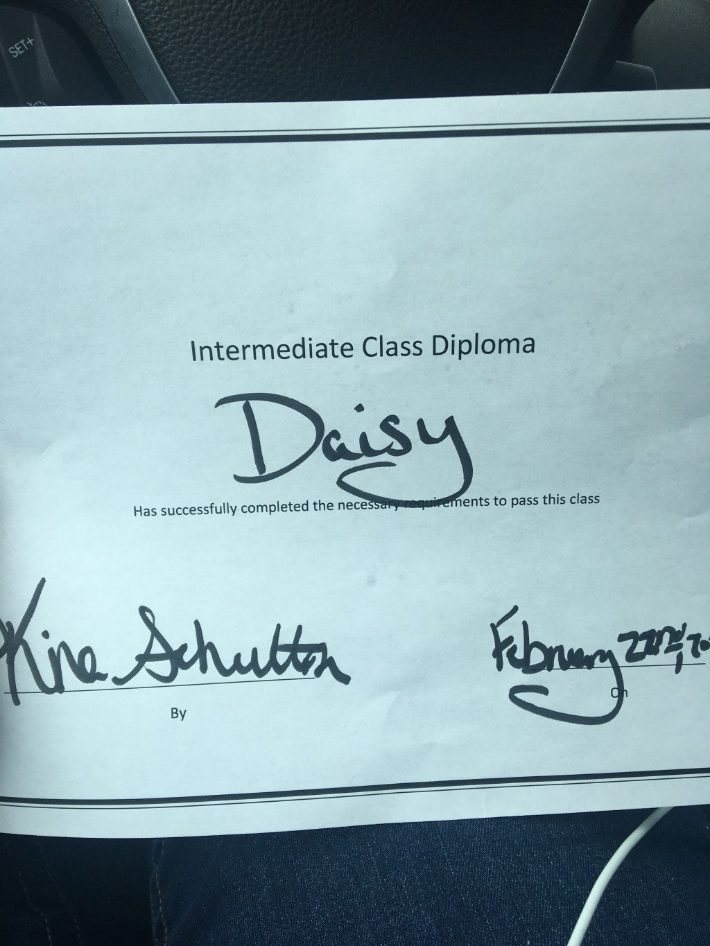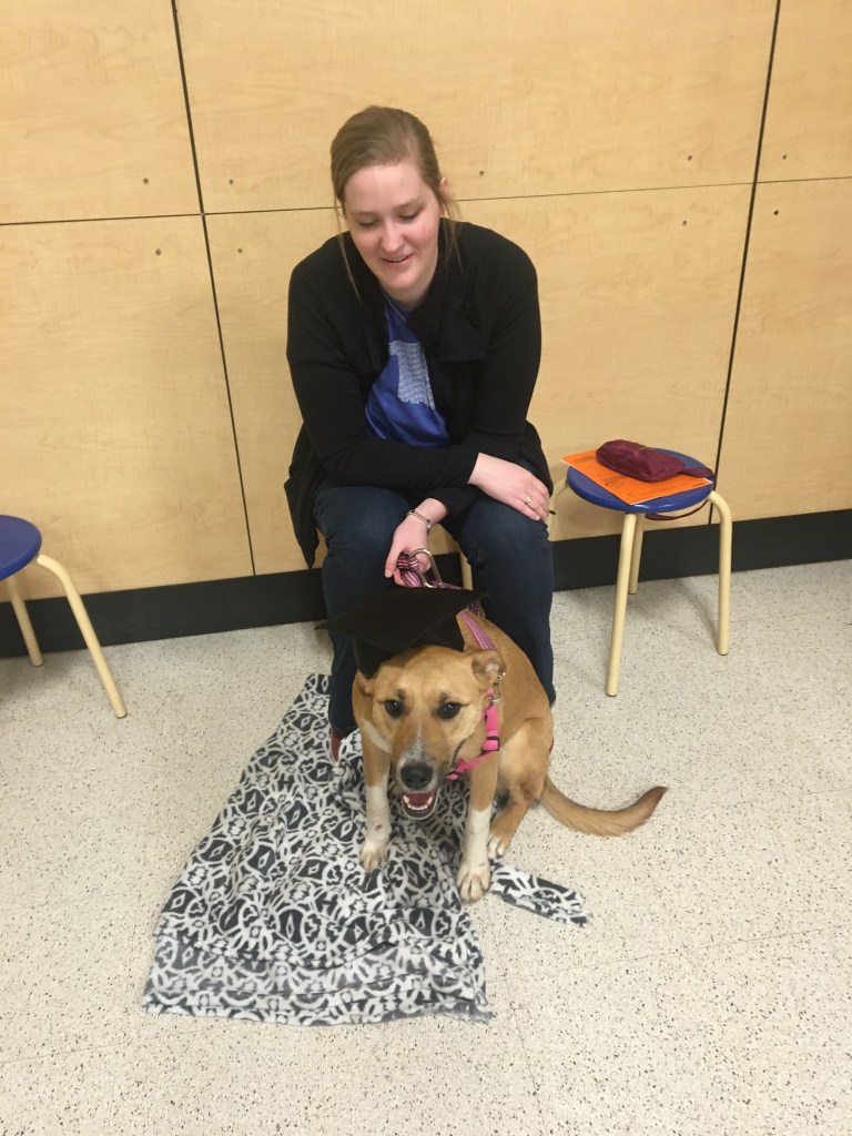 She didn’t do the best during her test. She wouldn’t even sit. But, she passed, and she looked pretty cute in the graduation hat.