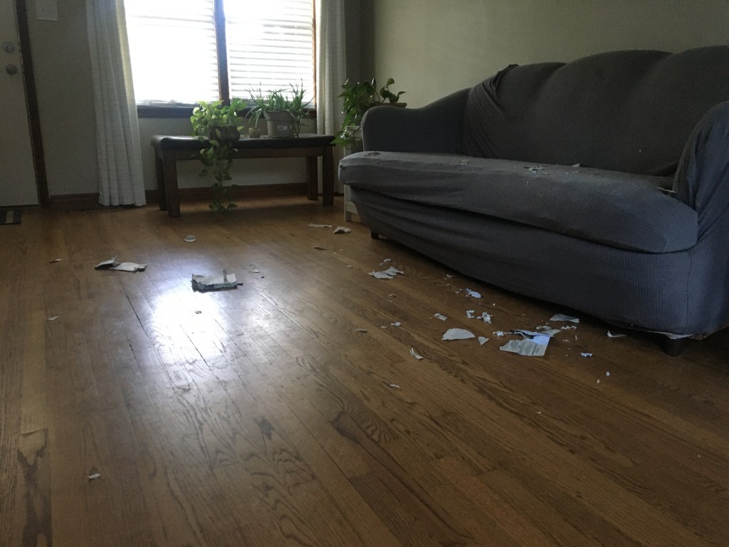 But, several hours later, it still sits. Little clusters of page sprinkled on the couch, the book’s title page sitting half-ripped and cockeyed on my hardwood floors. The original tome rests a few inches from its entrails, corner-less, bite marks telling a story.